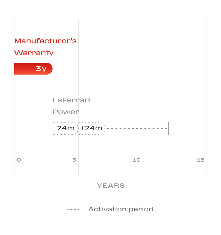 Power16 is a paid Service Contract that protects the main components of the Ferrari, including engine, transmission, suspension, steering, and electrical system. This coverage ensures maintenance of the car’s safety and performance standards from the 9th to the 16th year and also includes roadside assistance service.