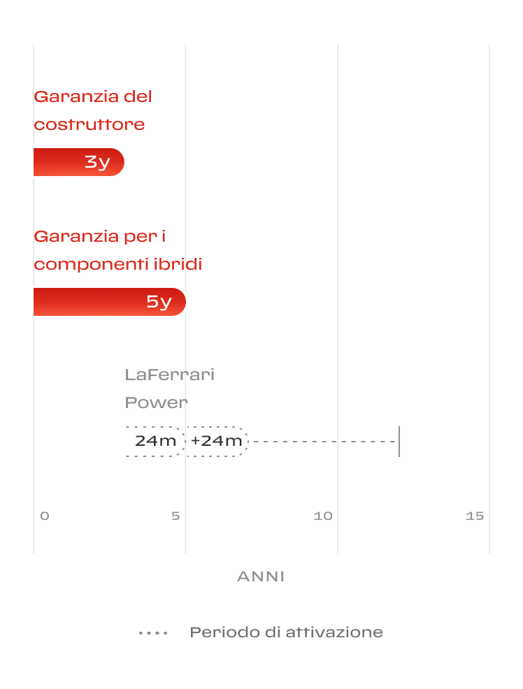 La Garanzia per i componenti ibridi Ferrari offre una copertura standard di 60 mesi a partire dalla prima consegna della vettura al Cliente finale. Questa garanzia copre specificamente il sistema ibrido e i suoi componenti, tra cui il sistema di gestione della batteria (BMS e CSC), i moduli Inverters, la batteria ad alto voltaggio HVB, il modulo di controllo per la gestione dell’alimentazione elettrica e i motori elettrici. Essa permette inoltre ai proprietari di godere dell'esperienza di guida Ferrari con la tranquillità di un sistema ibrido protetto.