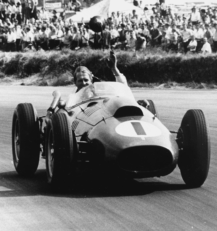 Inconfondibile anche il suo casco verde con frontino bianco e ampia visiera trasparente, raramente sostituita da un paio di occhialoni. Alto e magro, con un ciuffo di capelli biondi e un viso da eterno ragazzino, è il pilota che più di ogni altro dà filo da torcere a Juan Manuel Fangio sulla prestazione pura. Solo lui è in grado di compiere le stesse manovre che riescono al campione argentino, come tenere completamente giù l’acceleratore nella curva di Gueux, a Reims. Con la Scuderia Ferrari fa proprio il Campionato Mondiale di F1 nel 1958 e contribuisce alla conquista dei titoli Sport negli anni ’53, ’54, ’57 e ’58. Vince la 24 Ore di Spa-Francorchamps con Farina nel ’53 mentre nel 1954 conquista il Tourist Trophy a Dundrod ma anche altri piazzamenti. È il primo pilota britannico a conquistare il titolo iridato. Il suo debutto in F1 avviene nel ’52 al volante di una Cooper-Bristol e i buoni risultati gli valgono l’ingaggio da parte di Enzo Ferrari, che per i corridori di talento ha sempre avuto fiuto.