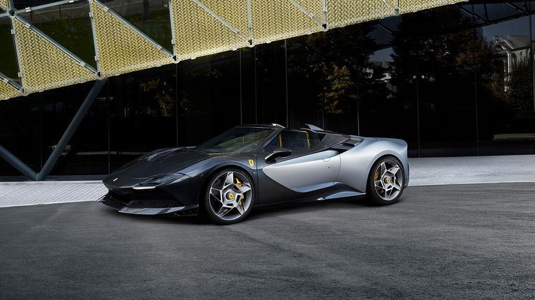 A livello di interni riveste particolare importanza la modifica della consolle centrale per alloggiarvi i comandi F1 introdotti nella gamma Ferrari dalla SF90 Stradale in poi. È stato così possibile aggiungere l’ormai iconico cancelletto, rendendosi necessario un suo adattamento alle modalità di funzionamento di questa vettura. Completano il quadro i sedili con specchiatura specifica in Alcantara® Blu Navy laserata ed accoppiata con tela ad effetto gradiente, nonché i tappeti in tessuto twill specifico con effetto cangiante.