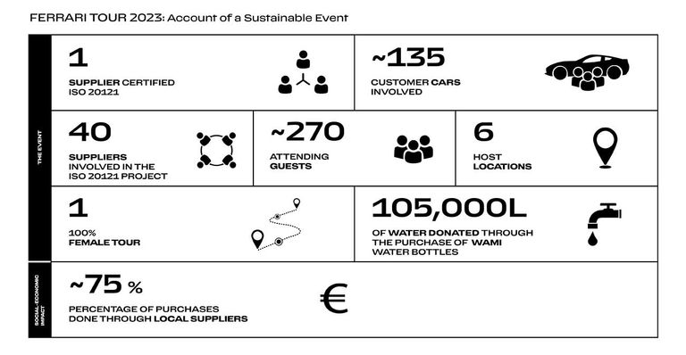 Ferrari confirms its commitment to sustainable development achieving ISO 20121 certification for the European stages of Ferrari Tour for the 2024 from the certifying body TÜV NORD Italia. The standard applies to the design, organisation and execution of events that are consistent and aligned with the five pillars of the Ferrari Group's sustainability strategy.