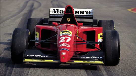 法拉利F50系列与F1之间的直接联系不仅超越了技术极限,还突破了传播新高度,壳牌超凡喜力润滑油也特意在广告宣传中强调F50的动力组件。这一车型在日内瓦车展正式亮相,旨在庆祝法拉利车队成立50年,它是真正的公路版F1赛车车型。 F50的12缸发动机源自尼格尔·曼塞尔(Nigel Mansell)和阿兰·普罗斯特(Alain Prost)在比赛中驾驶的640和641的装备,其排量也从3500 cc提升至4698 cc。然而,F1赛车对它的影响不仅仅体现在引擎上。事实上,F50承袭了单座赛车的整体理念。发动机组件与单座赛车的配置相同,不仅具有支撑功能,还与后悬架推杆连接在一起。前悬架与碳纤维材质的底盘固定在一起,其设计灵感源于80年代的126 C。尖端材料的运用也让F50与F1赛车同出一撤。工程师们为F50选用碳素纤维车身,钛合金连杆,铝镁轻合金的轮辋和轮毂。后轮毂则采用法拉利为单座赛车而发明并获得专利的解决方案,以此降低功率损耗。